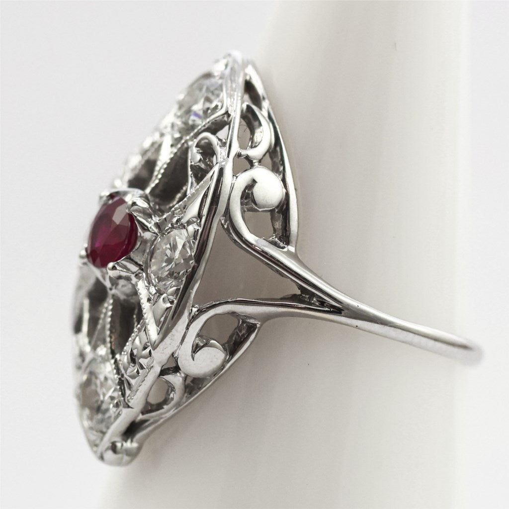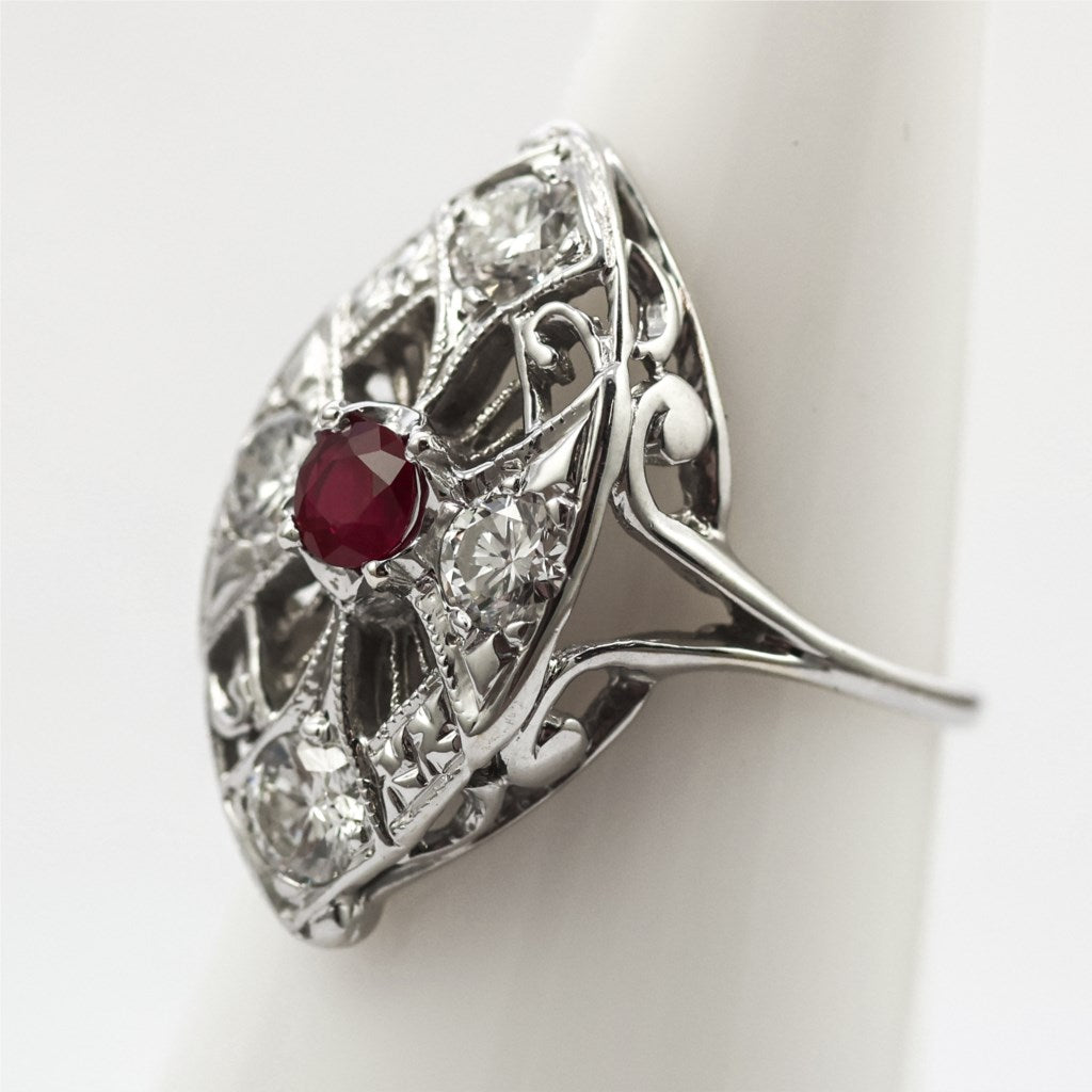 - This Art Deco 14kt white gold filigree ring features a .35 carat round ruby accented by four round, brilliant cut diamonds estimated to weigh a total of 1.20 carats grading as G-H in color and SI-1 in clarity