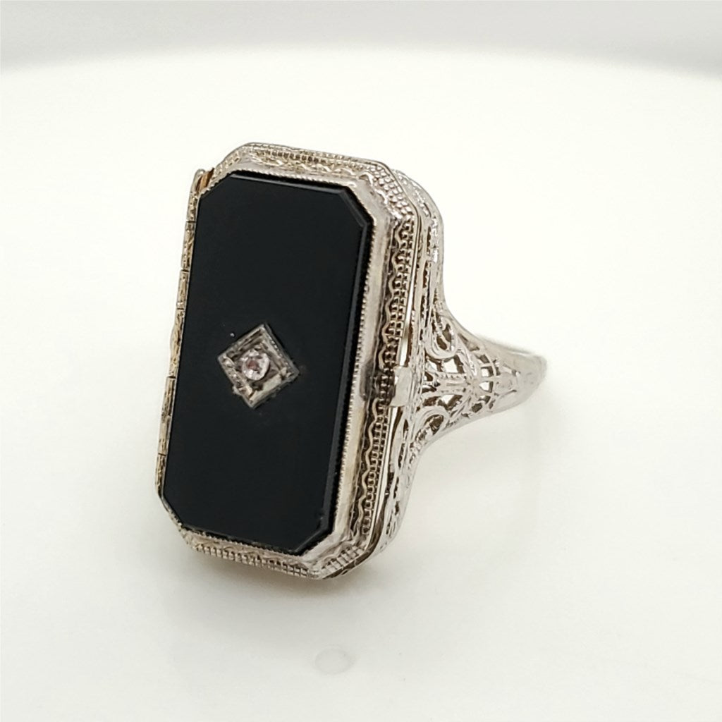 - Late Art Deco 14kt white gold filigree flip ring with rectangular cameo on one side and black onyx inset with diamond on the other