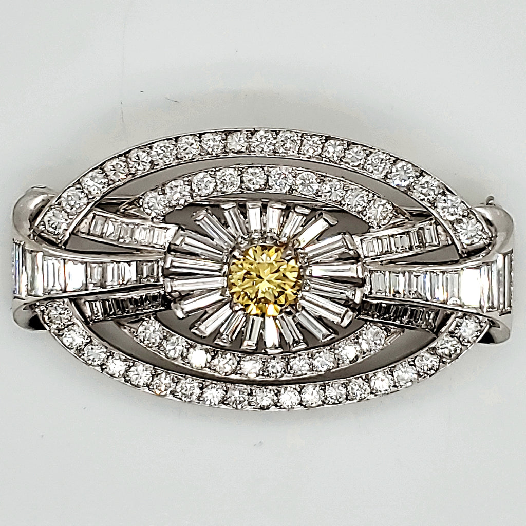 - Magnificent Numbered Art Deco Platinum brooch centered by an estimated 1.00 carat Irradiated yellow diamond accented by 56 baguette cut and 58 round european cut diamonds with an estimated total weight of 6.50 carats grading as F-G in color and VS in clarity