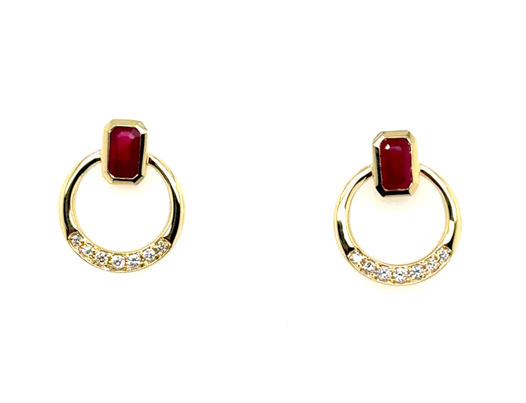 - 14kt yellow gold round circular drop earrings featuring two emerald cut red rubies weighing a total of 0.67 carat and 14 brilliant round cut diamonds weighing a total of 0.13 carat, grading as g-h, vs2-si1
