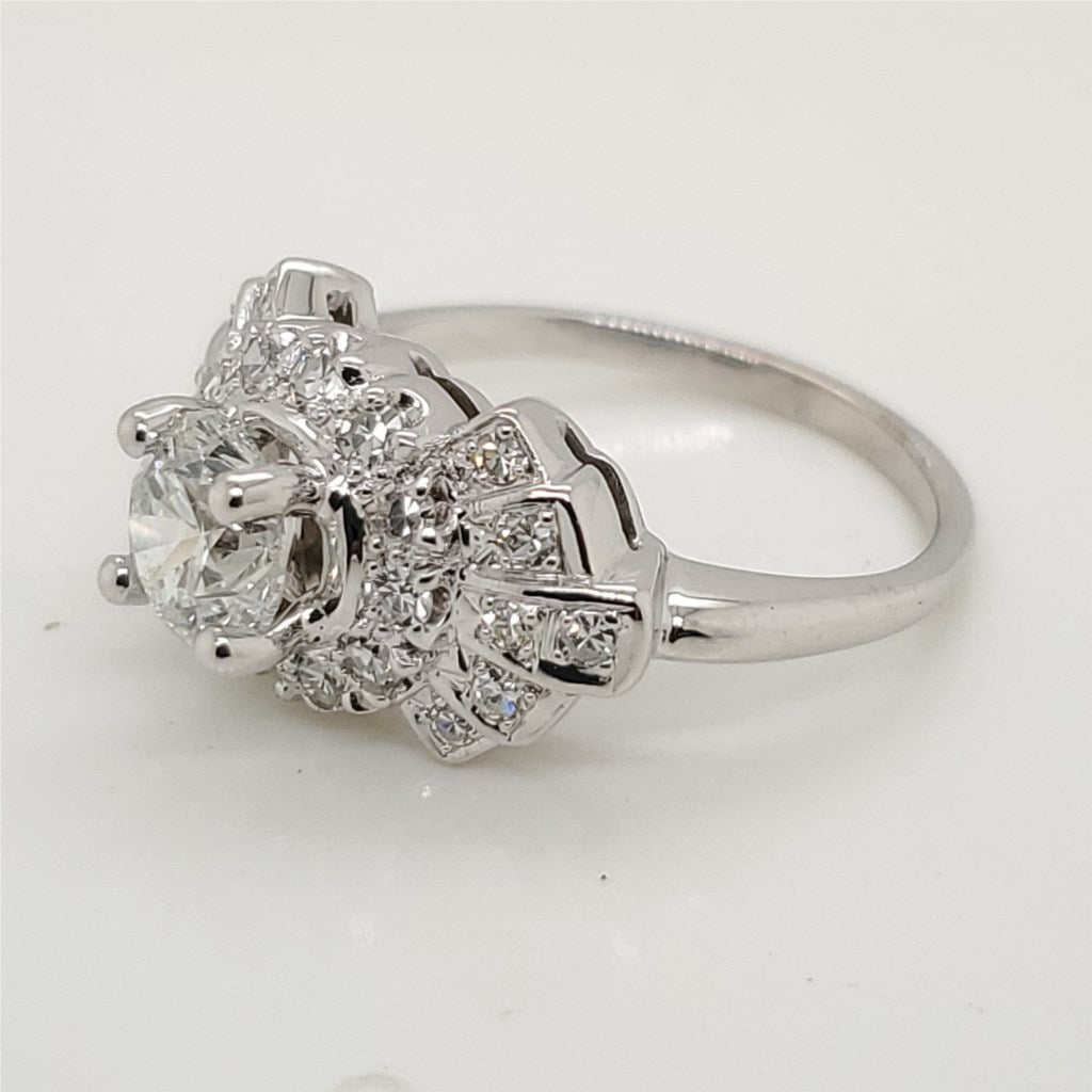 - Vintage 14kt white gold engagement ring hosting a 1.02 carat round, brilliant cut diamond grading as H in color and I-1 in clarity accented by 24 old single cut diamonds with an estimated total weight of .50 carat