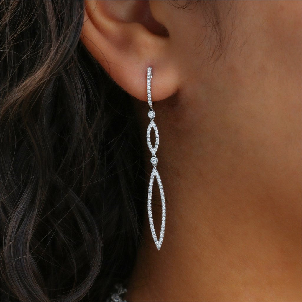 - 14kt white gold long dangle earrings set with 150 brilliant round cut diamonds weighing a total of 0.60 carat and grading as g-h in color, vs2-si1 in clarity