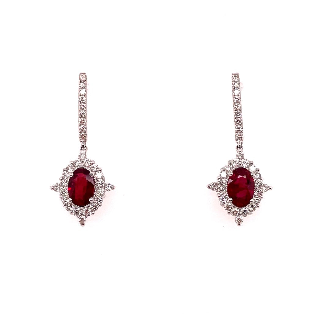 - 18kt white gold drop earrings featuring two oval cut red rubies weighing a total of 1.12 carats surrounded by 58 brilliant round cut diamonds weighing a total of 0.52 carat
