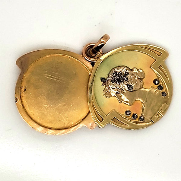 $3,495.00Antique Art Nouveau 18kt yellow gold enamel locket with woman in profile with 16 rose cut diamondsQuick View {"id":7732615708737,"title":"Art Nouveau 18Kt Yellow Gold Enamel And Diamond Locket","handle":"art-nouveau-18kt-yellow-gold-enamel-and-diamond-locket","description":"Antique Art Nouveau 18kt yellow gold enamel locket with woman in profile with 16 rose cut diamonds","published_at":"2025-12-09T13:22:33-06:00","created_at":"2025-12-09T13:22:32-06:00","vendor":"Jack Pritchard","type":"Gold Pendants\/Charms","tags":["18 Karat","18k","18K Gold","18kt","1910s","antique","art","art nouveau","Charms","diamond","enamel","estate","gold","Gold Pendants","Jack Pritchard","JewelCloud","Jewelry","locket","None","nouveau","pendant","Pendants","round locket","Unisex","vintage","Yellow"],"price":287500,"price_min":287500,"price_max":287500,"available":true,"price_varies":false,"compare_at_price":349500,"compare_at_price_min":349500,"compare_at_price_max":349500,"compare_at_price_varies":false,"variants":[{"id":43151901524033,"title":"Default Title","option1":"Default Title","option2":null,"option3":null,"sku":"001-435-03576","requires_shipping":true,"taxable":true,"featured_image":null,"available":true,"name":"Art Nouveau 18Kt Yellow Gold Enamel And Diamond Locket","public_title":null,"options":["Default Title"],"price":287500,"weight":0,"compare_at_price":349500,"inventory_management":"shopify","barcode":null,"requires_selling_plan":false,"selling_plan_allocations":[]}],"images":["\/\/levysfinejewelry.com\/cdn\/shop\/files\/435-03576.jpg?v=1765792399","\/\/levysfinejewelry.com\/cdn\/shop\/files\/435-03576-02.jpg?v=1765792399"],"featured_image":"\/\/levysfinejewelry.com\/cdn\/shop\/files\/435-03576.jpg?v=1765792399","options":["Title"],"media":[{"alt":"Art Nouveau 18Kt Yellow Gold Enamel And Diamond Locket","id":28292336779329,"position":1,"preview_image":{"aspect_ratio":1.0,"height":1024,"width":1024,"src":"\/\/levysfinejewelry.com\/cdn\/shop\/files\/435-03576.jpg?v=1765792399"},"aspect_ratio":1.0,"height":1024,"media_type":"image","src":"\/\/levysfinejewelry.com\/cdn\/shop\/files\/435-03576.jpg?v=1765792399","width":1024},{"alt":"Art Nouveau 18Kt Yellow Gold Enamel And Diamond Locket","id":28292336812097,"position":2,"preview_image":{"aspect_ratio":1.0,"height":1024,"width":1024,"src":"\/\/levysfinejewelry.com\/cdn\/shop\/files\/435-03576-02.jpg?v=1765792399"},"aspect_ratio":1.0,"height":1024,"media_type":"image","src":"\/\/levysfinejewelry.com\/cdn\/shop\/files\/435-03576-02.jpg?v=1765792399","width":1024}],"requires_selling_plan":false,"selling_plan_groups":[],"content":"Antique Art Nouveau 18kt yellow gold enamel locket with woman in profile with 16 rose cut diamonds"}