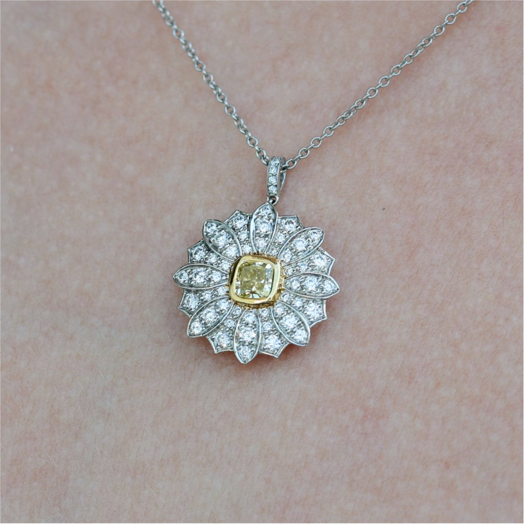 - Pre-owned Tiffany & Co Daisy pendant with .43 carat radiant cut diamond grading as fancy intense yellow in color and internally flawless in clarity accented by 45 round, brilliant cut diamonds with a total weight of .50 carat