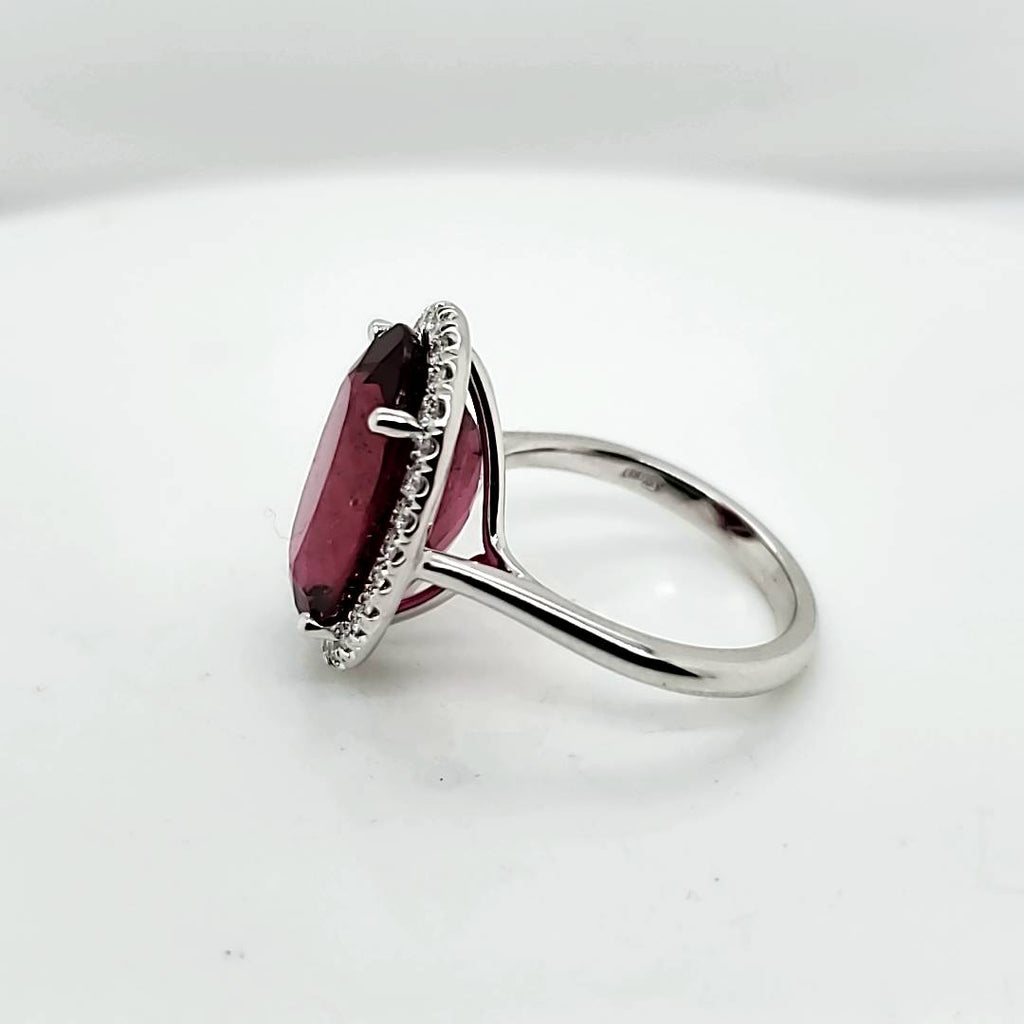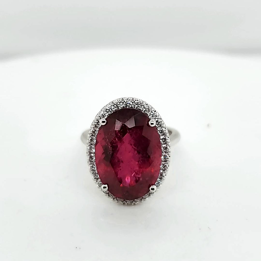 - 14kt white gold ring featuring a 9.84 carat oval Rubelite Tourmaline accented by a rim of 30 matched round, brilliant cut diamonds with a total weight of .36 carat