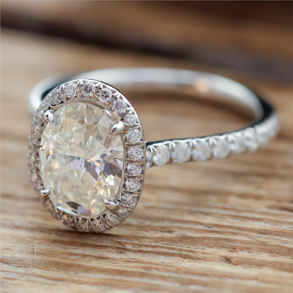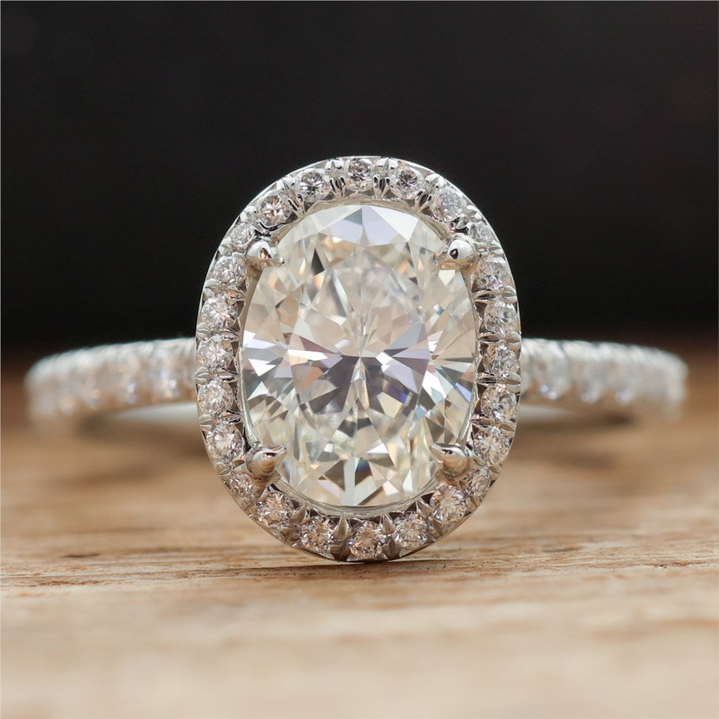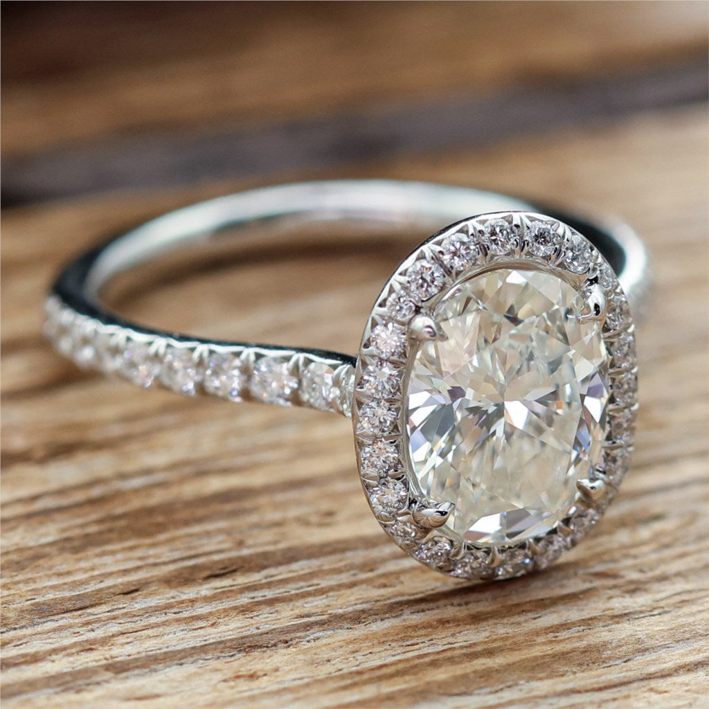 - Pre-owned Tiffany & Co platinum engagement ring hosting a 1.67 carat oval diamond grading as I in color and VVS-2 in clarity accented by7 .45 carat of round, brilliant cut diamonds