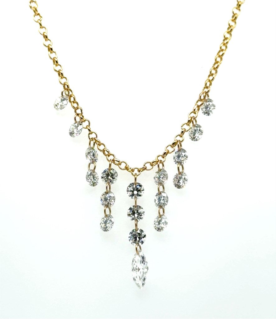 - 14kt yellow gold 18 inch floating diamond Cleopatra necklace set with one marquise cut and 17 brilliant round cut diamonds weighing a combined weight of 1.63 carats. Grading as g-h in color, vs2-si1 in clarity