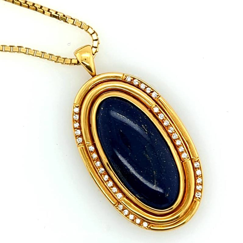 - Vintage 18kt yellow gold pendant necklace centered by a 30x15mm oval Lapis accented by 36 round, brilliant cut diamonds on an 18kt gold square link chain