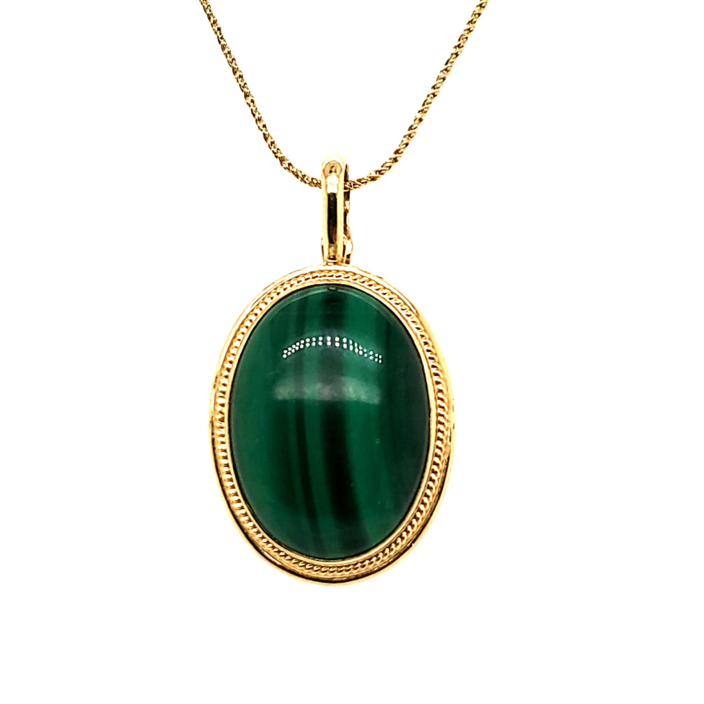 - 14kt yellow gold pendant hosting a 25x18mm oval Malachite