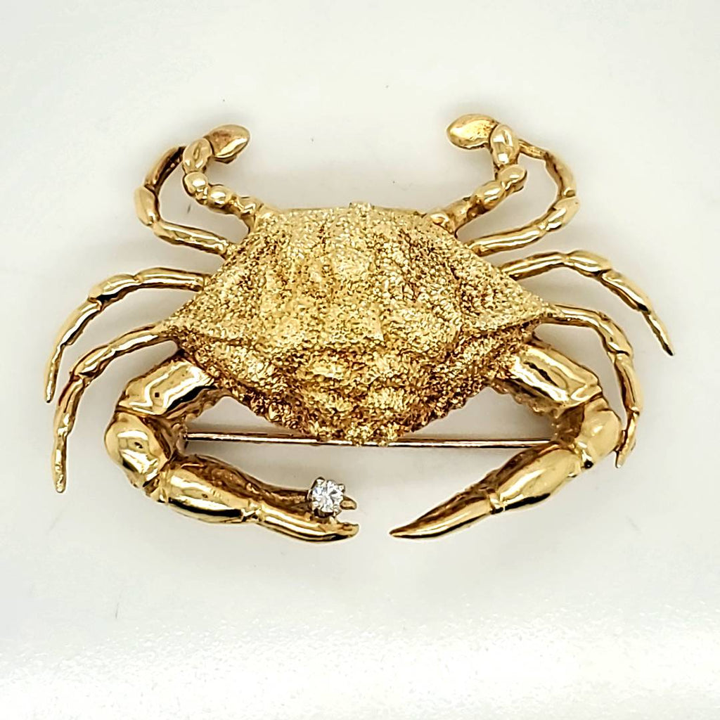 - Vintage 18kt yellow gold crab brooch with one round, brilliant cut diamond
