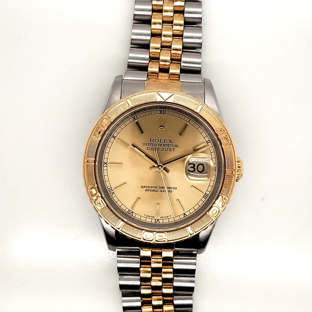 - Pre-owned 1997 1/2 38mm Rolex Datejust Turn-O-Graph stainless steel and 18kt yellow gold jubilee band champagne dial w/ gold stick markers reference#16263 in box with papers