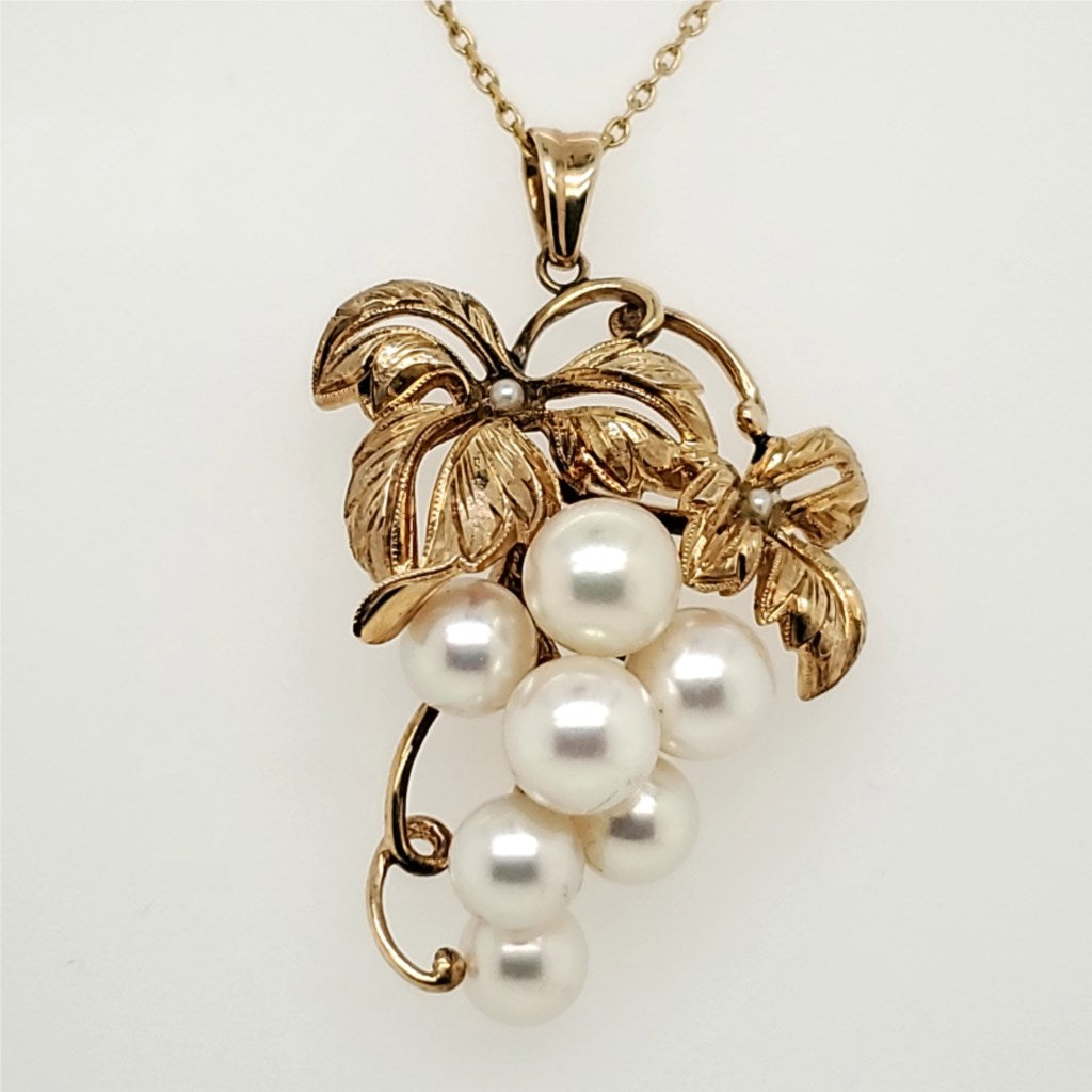 - Vintage Mikimoto 14kt yellow gold grape cluster pendant wiht seven round cultured Akoya pearls