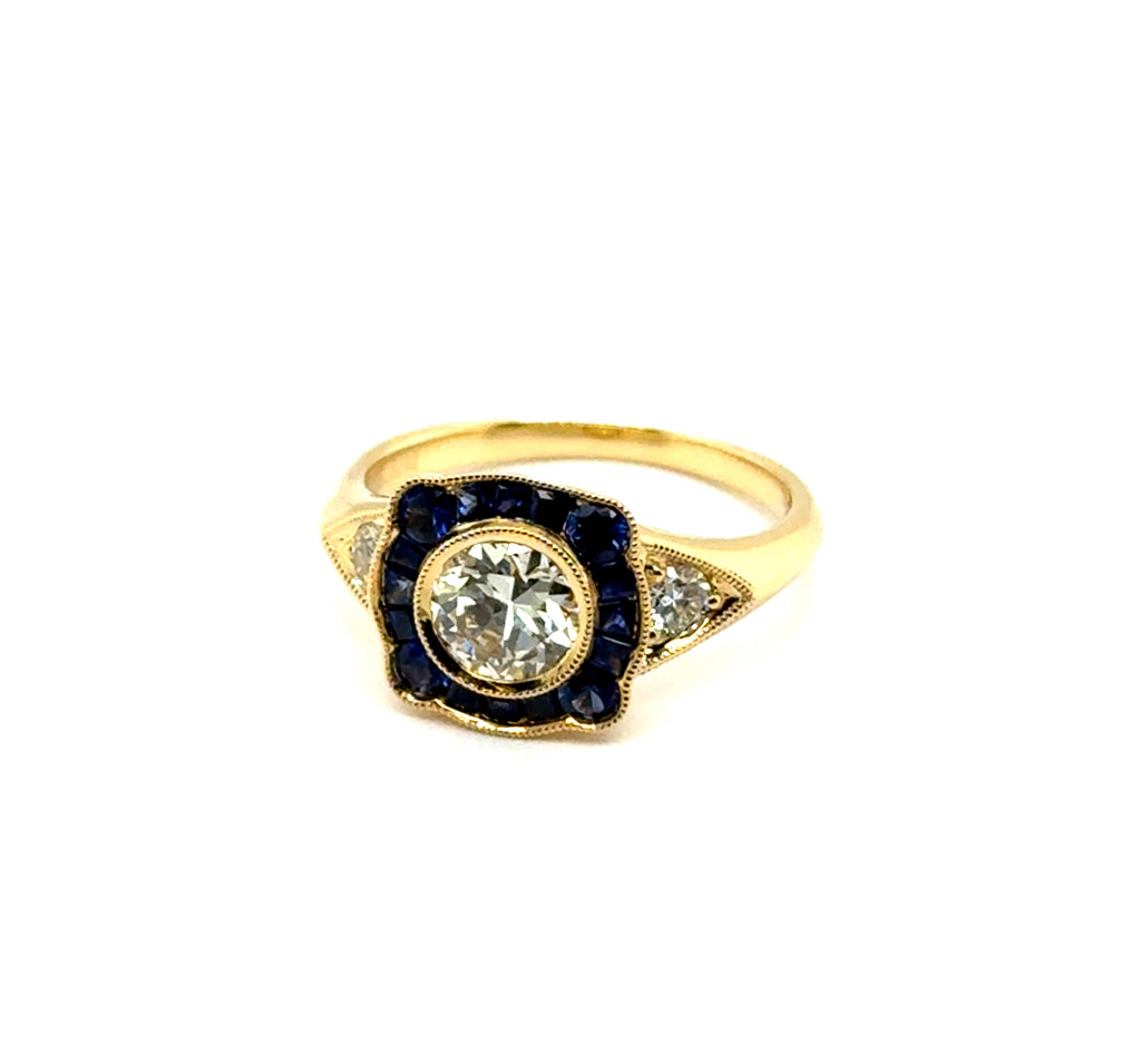 0.78 Carat European Cut Diamond and Sapphire 18kt Yellow Gold Engagement Ring