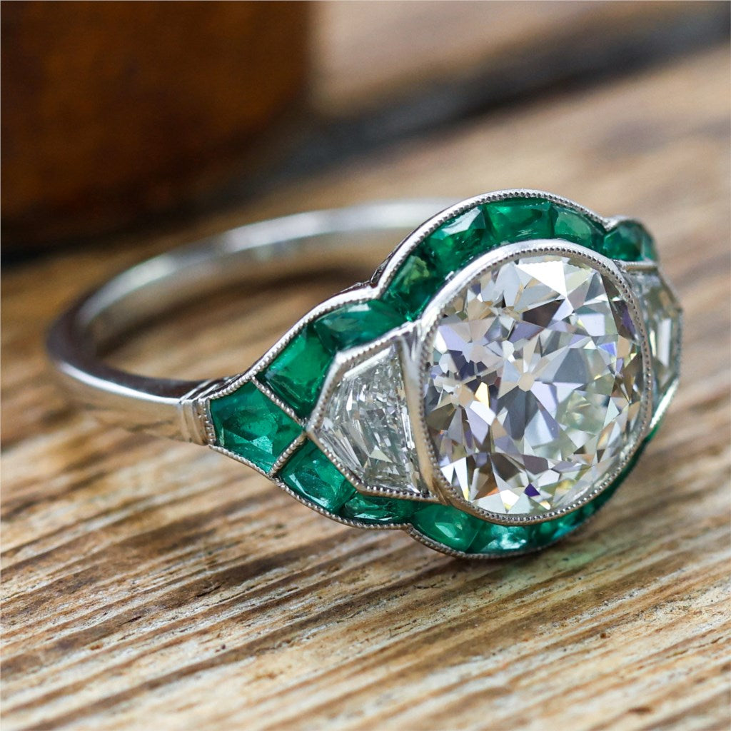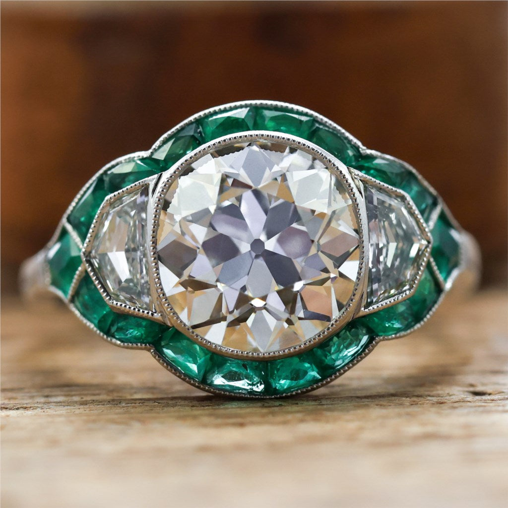 - Modern art Deco style engagement ring featuring one 3.01 carat european cut diamond grading as K in color and SI-1 in clarity accented by two trapezoid diamonds with a total weight of .55 carat and 18 calibre emeralds weighing 3.00 carats