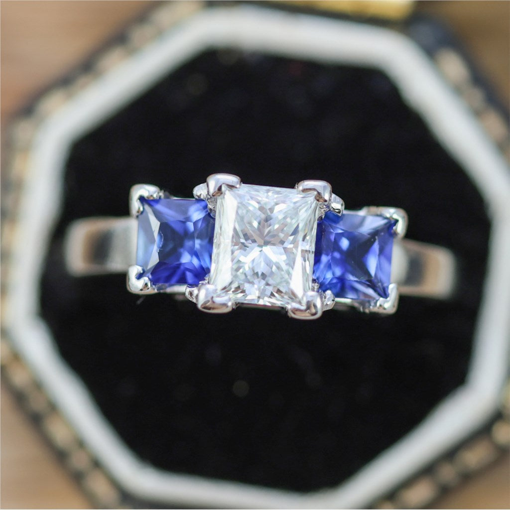 - Platinum engagement ring hosting a .94 carat princess cut diamond grading as E in color and VS-1 in clarity accented by matching princess cut blue sapphires with a total weight of .93 carat