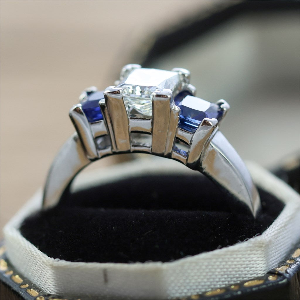 Platinum .94 Carat Princess Cut Diamond and Sapphire Engagement Ring