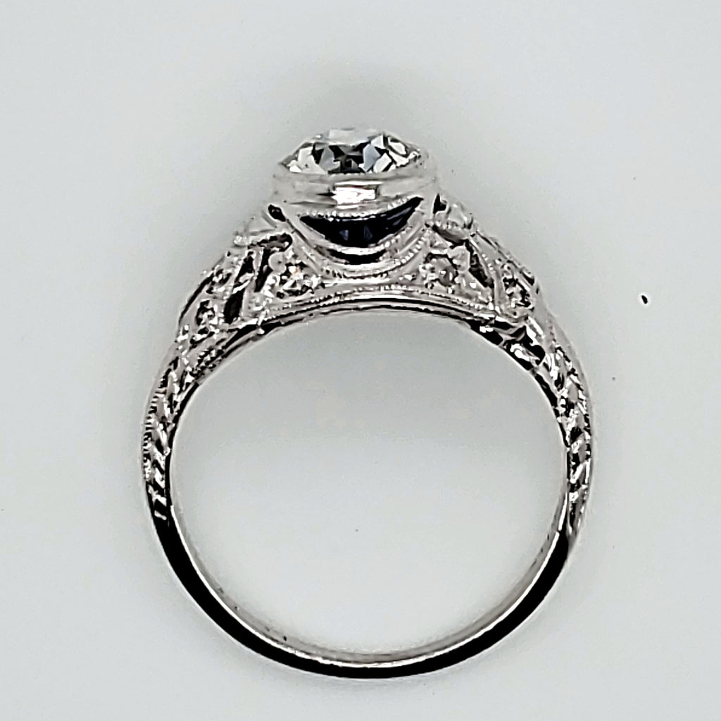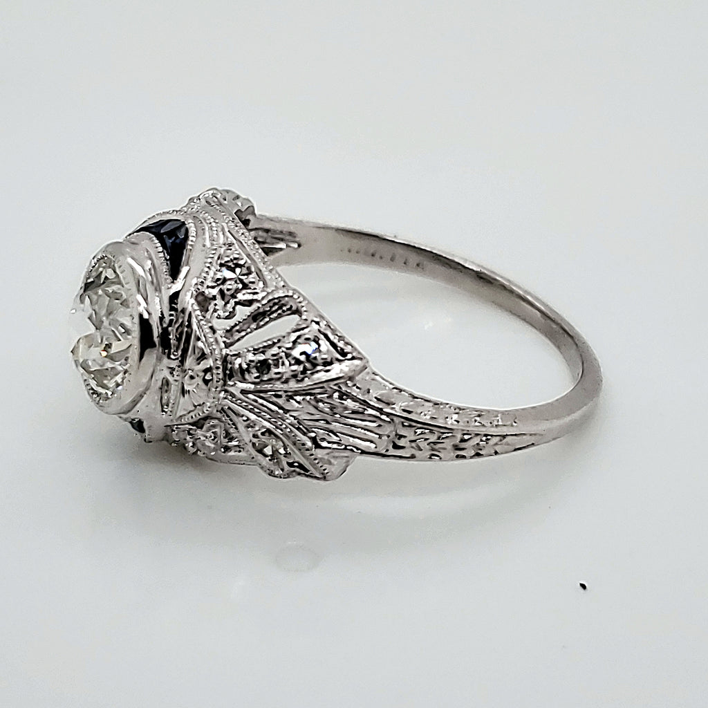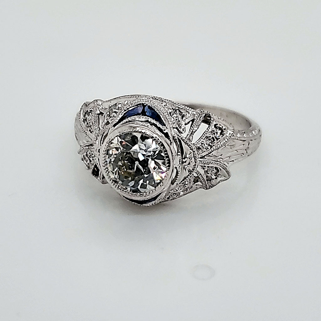 - Art Deco platinum filigree ring hosting one .80 carat bezel set round, european cut diamond grading as J in color and VS-2 in clarity accented by 10 round diamonds and four calibre' cut blue sapphires