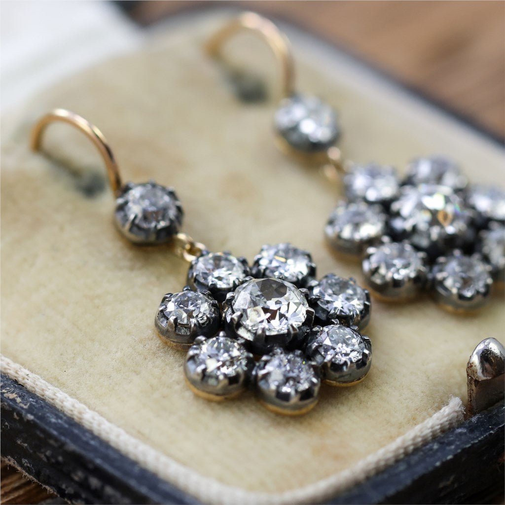 - Modern Victorian style dangle earrings in blackened sterling silver and 18kt yellow gold set with 20 old mine and european cut diamonds with a total weight of 3.80 carats