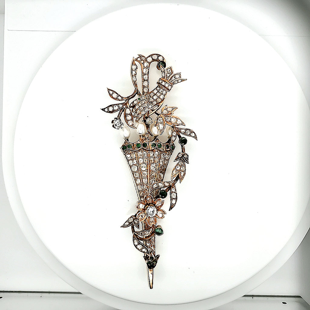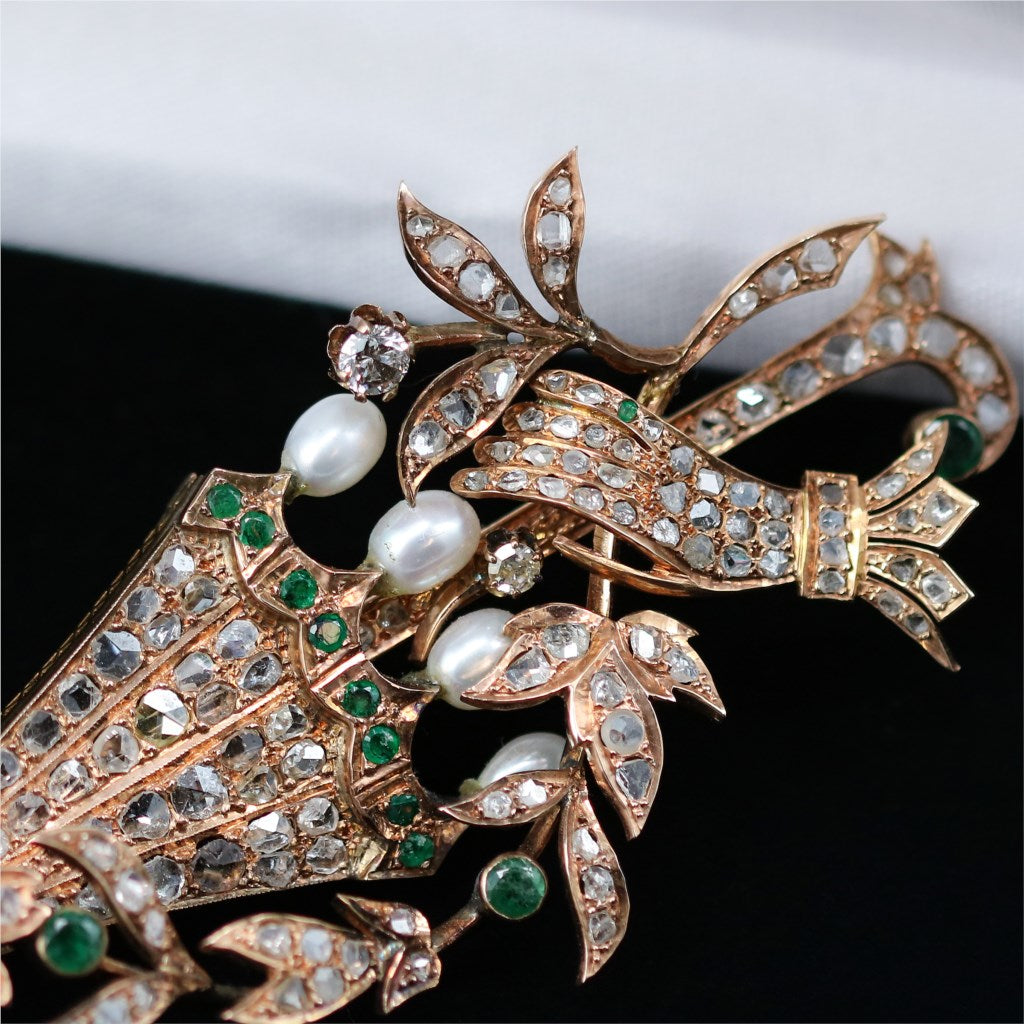 Antique mid Victorian rose gold diamond,emerald & pearl flower vase brooch