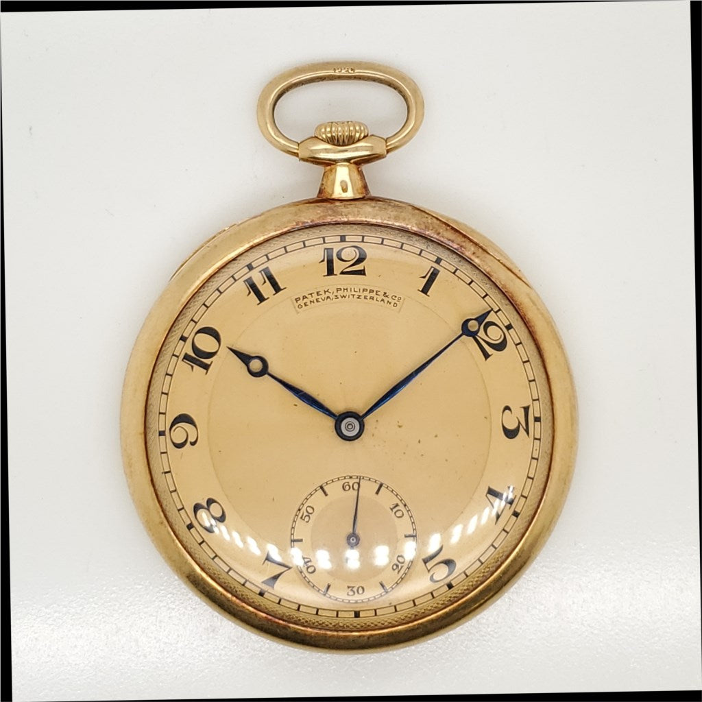 - Antique 1920-1925 18kt yellow gold Patek Philippe open faced pocket watch with champagne dial triple signed 45mm