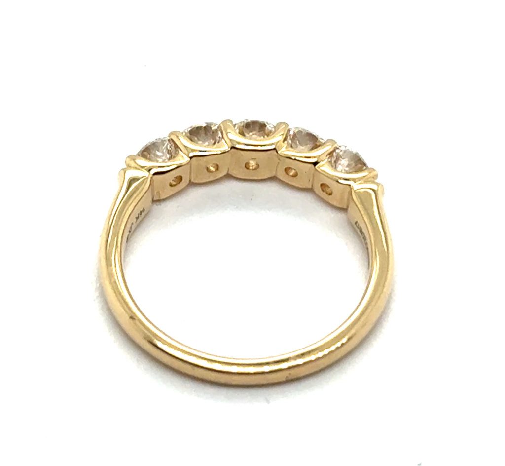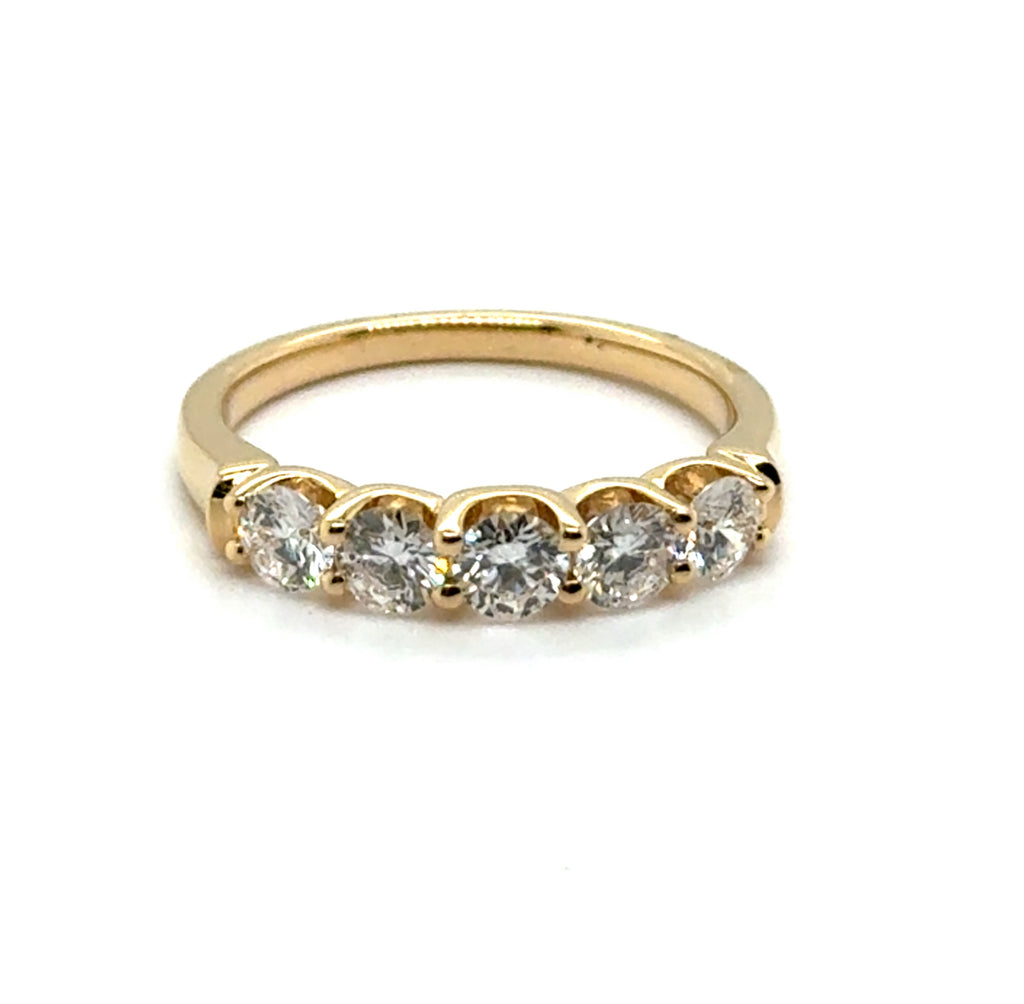 - 14kt yellow gold stackable wedding band set with five brilliant round cut diamonds weighing a total of 1.01 carats and grading as g-h in color, vs2-si1 in clarity. Finger size seven (7)
