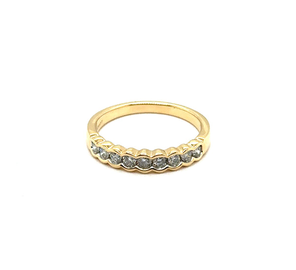 - 14kt white gold curved wedding band channel set with nine round, brilliant cut diamonds with an estimated total weight of .40 carat