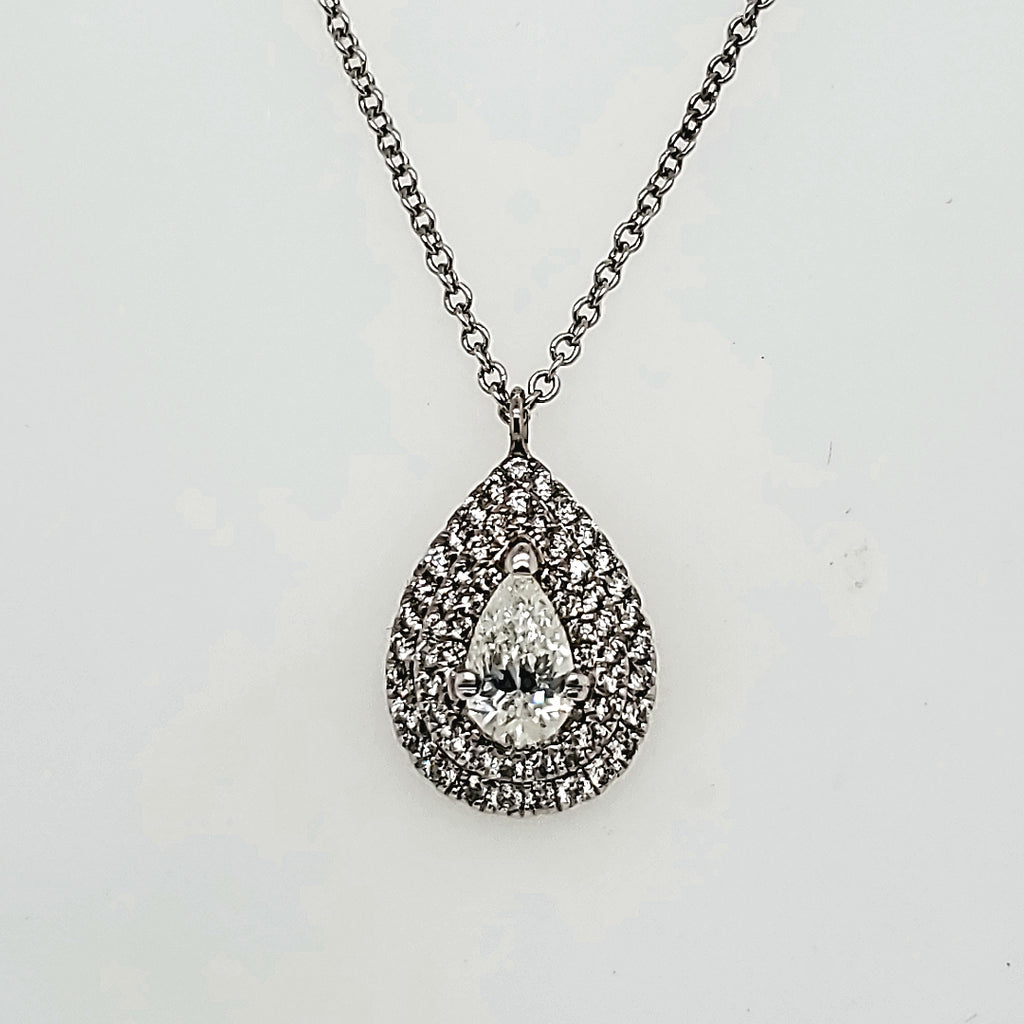 - 14kt white gold pendant necklace featuring an estimated .40 carat pear shaped diamond accented by 64 round, brilliant cut diamonds with an estimated total weight of .30 carat