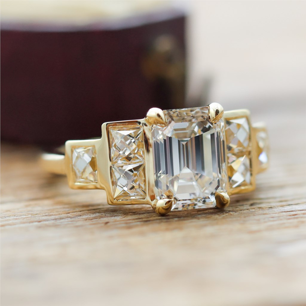 - 18kt yellow gold engagement ring centered by one 2.64 carat emerald cut diamond that is GIA certified as E in color and VS-2 in clarity accented by a geometric pattern of six french cut diamonds with a total weight of 1.41 carats