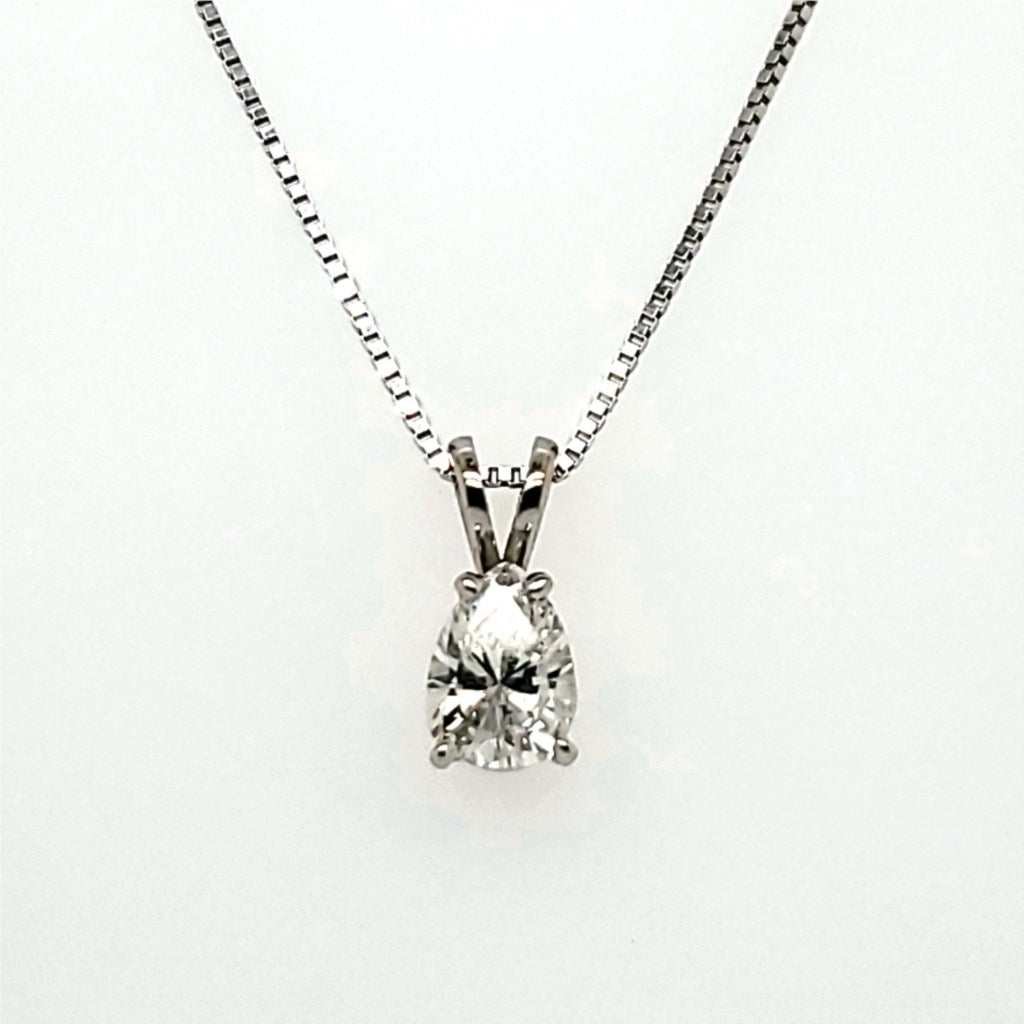 • 14kt white gold solitaire diamond pendant featuring an estimated .73 carat pear shaped diamond grading as J in color and SI-1 in clarity on a 14kt white gold chain