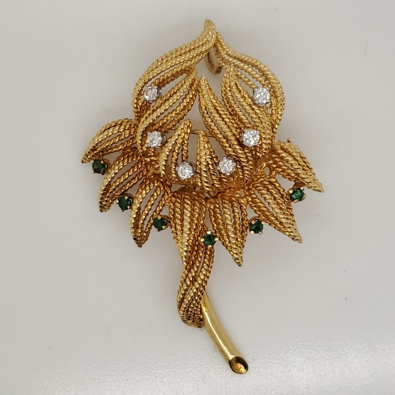 Vintage 18kt Yellow Gold Emerald and Diamond Brooch