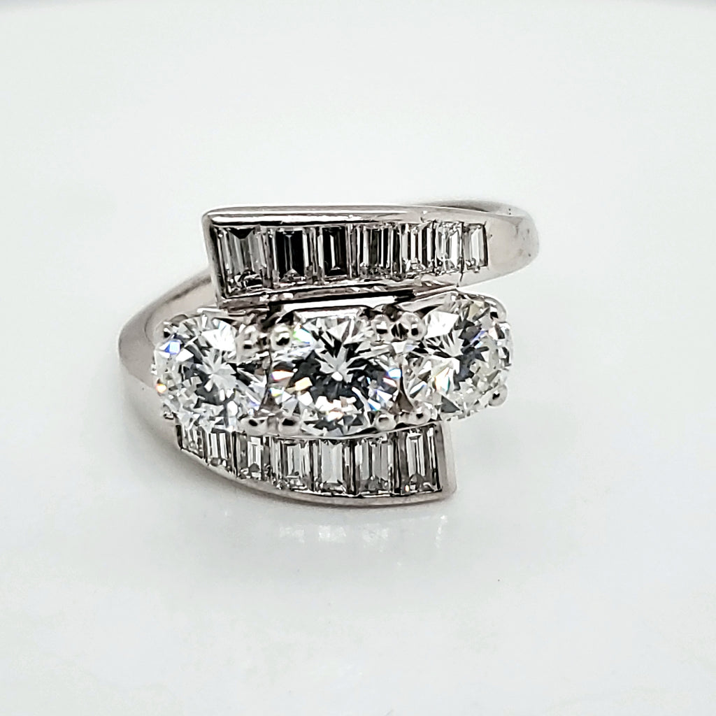 - Vintage platinum bypass ring set with three round, brilliant cut diamonds with a total weight of 1.64 carats bypassed by 14 baguette cut diamonds with an estimated total weight of .64 carat