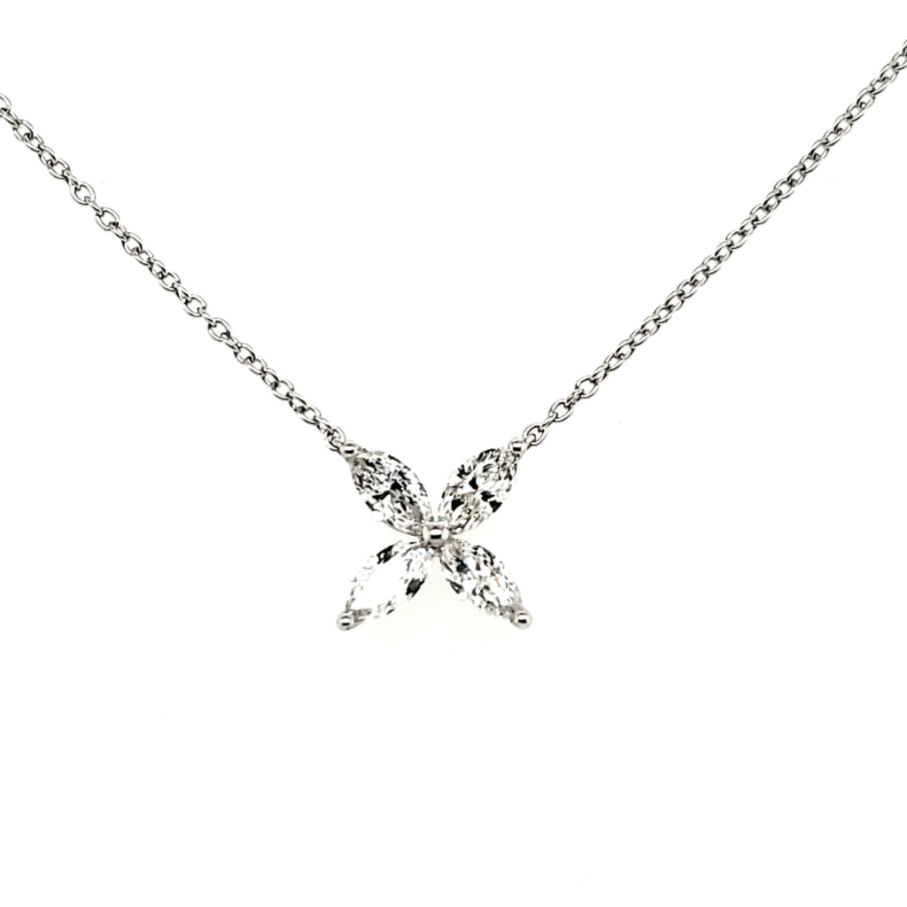 - 18k white gold pendant with four marquise cut diamonds (0.81ctw, G-H, SI1) on a 16 inch chain.